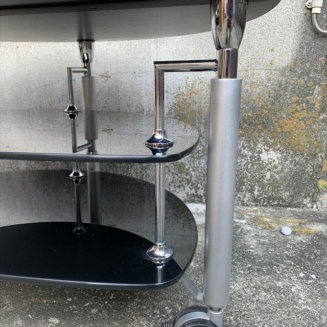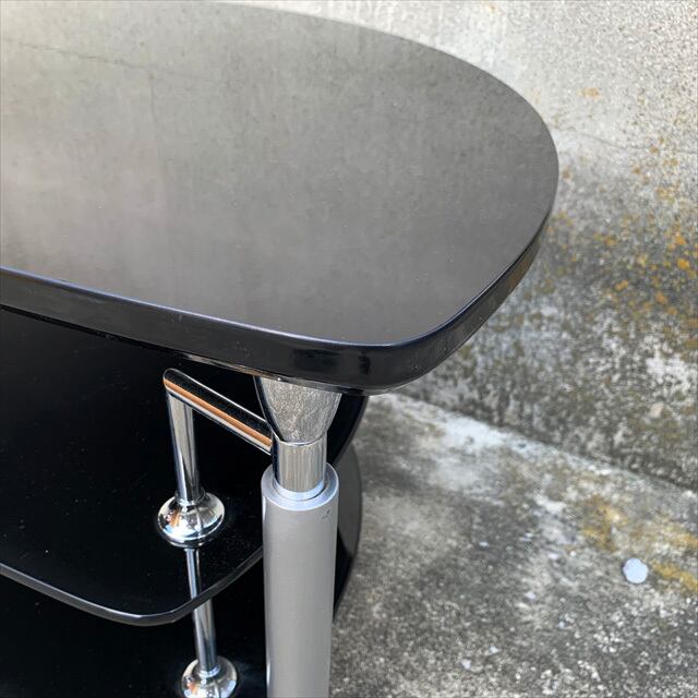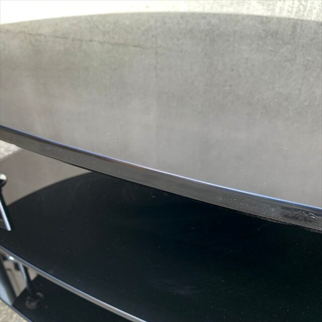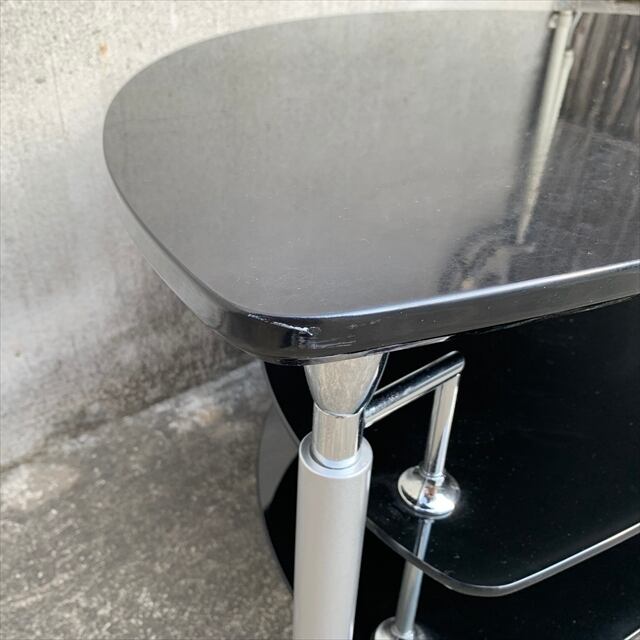 ハヤミ工産で製造されたタイメッツというシリーズのローボードワゴンを仕入れて来ました。本来の用途としては26?32インチ程度のテレビ台なのでご自宅のテレビ台として中段にはAV機器を置いて使われるのもいいんですが、キャスターが付いているのでロータイプのサイドテーブルのようなワゴンとして使われるのもオススメです。黒とメタリックな合わせがモダンで中段2枚の棚はガラスですっきりとした印象です。オーディオ台にも良いかもしれません。