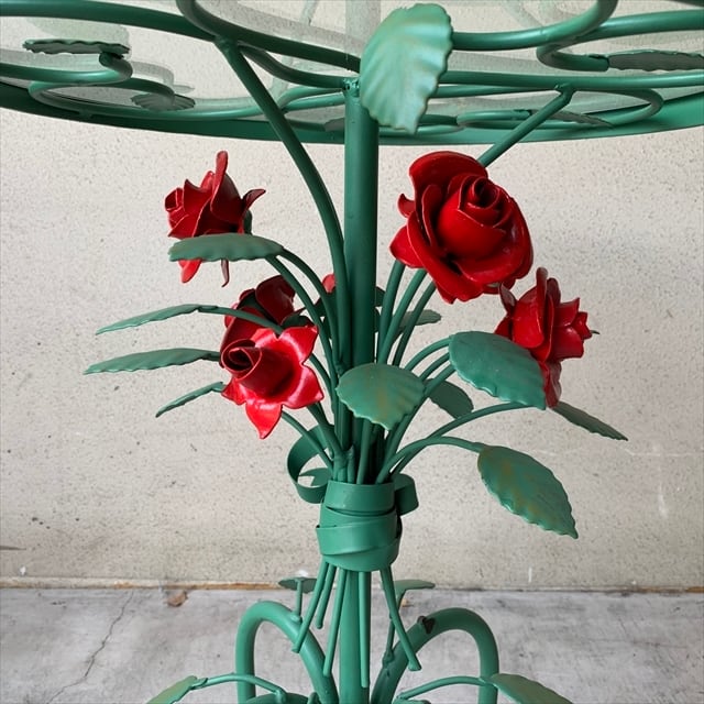 薔薇や葉っぱがデザインされたスチールベースに丸いガラス天板を合わせたサイドテーブルを仕入れて来ました。薔薇や葉っぱの装飾と色鮮やかなカラーバランスがとても良い!ということでチョイスしてきました。かなりくすんだような色合いのクラシックなものはたまに見かけますがここまでビビットな色合いはなかなか無いかと思います。ガーデン用にしてはもったいないのでお部屋のインテリアとしてお楽しみ頂けると嬉しいです。