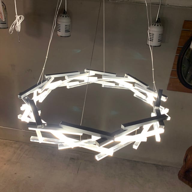山田照明のローリアLEDペンダントライトを2個仕入れて来ました。型番はPD-2566-Lになります。LEDの特徴を活かしたスリムなフォルムの照明から白熱灯の様にやわらかな光が部屋に広がります。繊細で透明感のあるデザインがとても素敵で枝や葉でつくるリースのようでそこからもれる太陽の光のようなイメージですね。現代的なシャンデリアとも言えるかと思います。高さは35cmから120cmまで調整可能のようです。そこもまた良いですよね。シーンに合わせてお使い下さいませ。目立つキズや大きな汚れなく綺麗な状態なのもオススメポイントとなります。本体自体は軽く、ベース部の重さくらいなので天井のシーリング次第では賃貸でも取り付け可能かと思います。