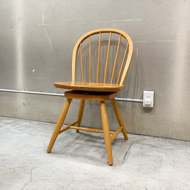 日本の木工家具産地として有名な岐阜県にある飛騨産業家具で70年代以降に生産されたオールドタイプのウィンザースタイルで回転するダイニングチェアを仕入れて来ました。ナチュラルなカラーと角のない丸みのあるフォルムが可愛らしいチェア。回転するのでデスク用としてもいいかもしれません。