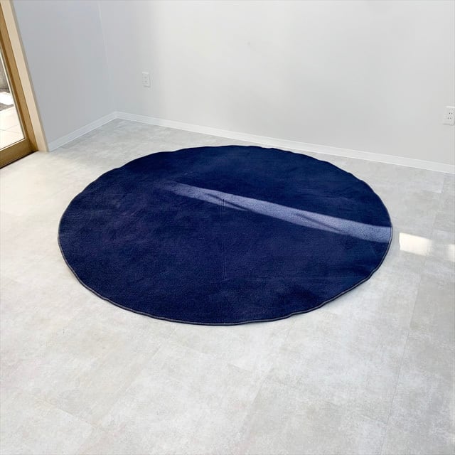 イデーのオーダーにて作られた大判のラウンドラグを仕入れて来ました。1980年代スタートの日本インテリアメーカーIDEE。国内外からのセレクトとオリジナル品で多くのデザイナーズ作品も取り扱っています。こちらのラグはネイビーのポリエステル系糸を使った薄めで軽量な使いやすくインテリアには合わせやすいラグになります。直径2mとかなり大きなサイズなんですが、ラウンド型なのでそこまで大きすぎる感じはありません。