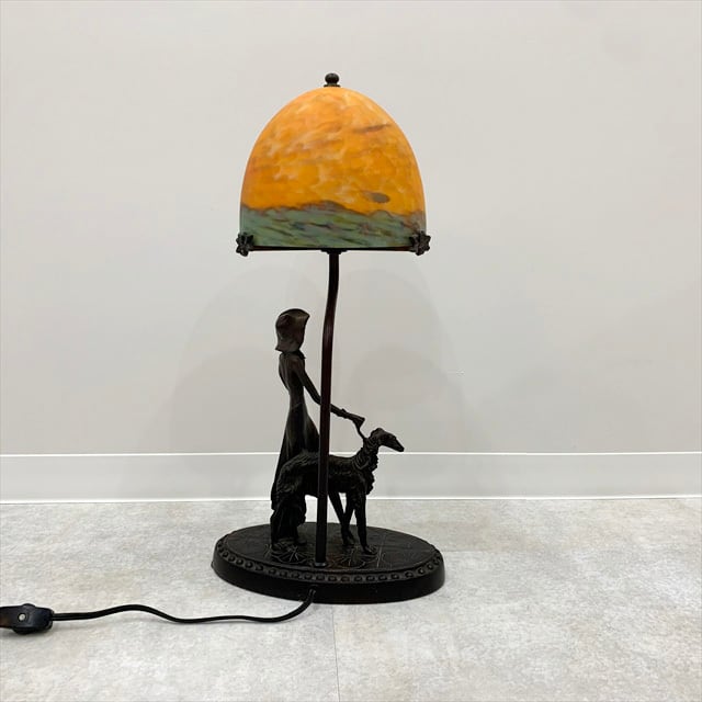 1998年頃にマツヤマ工芸で製造された卓上ランプを仕入れて来ました。マツヤマ工芸はガレ風やアールヌーボー調などのアンティーク、ヨーロピアンテイストの照明器具を製造販売しているメーカーとインターネットにて拝見しました。確かにシェードはガレの様なデザインですし、グレーハウンドを散歩する貴婦人はイギリスですよね。ベースは恐らくブロンズで作られており、堅固な素材なのに丁寧な細かな装飾が入っているのでなかなか手の込んだ一品かと思います。お部屋を照らす照明というよりはオブジェクト的なこれ自体を楽しむようなものなんじゃないかと。