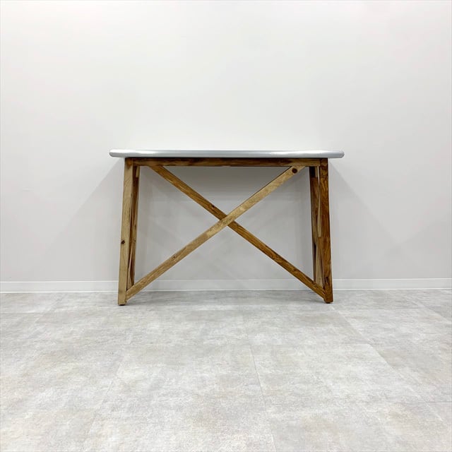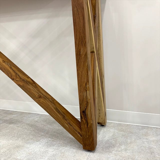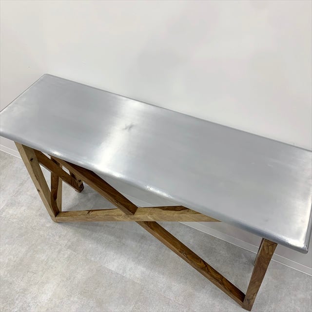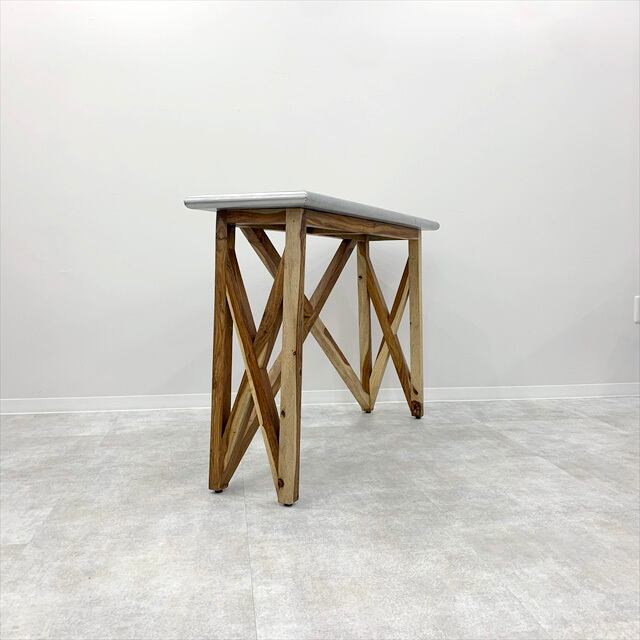 サーファーや西海岸デザイン向けに各種製品を作ってきたWTWのマーベリックシリーズコンソールテーブルを仕入れて来ました。自然な荒々しい木目や節のあるシーシャムウッドにアルミを天板に合わせた不思議でもバシッと雰囲気が締まる決まるデザインとなっています。通常X字の支え部分を背面にして利用するんだと思いますが、奥行きが狭くデスクとしては小さいのでデザインを押し出すために全面に持ってくるのがかっこいいと思います。