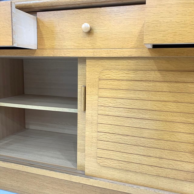 上下で分割可能です。日本で80年代頃に作られたであろうオーク材突板を使用したナチュラルな風合いのヴィンテージスリムカップボードを仕入れて来ました。ガラス扉上部のアーチデザインや球体の取っ手なんかが可愛らしい雰囲気を出してくれています。下部引き戸のボーダーデザインもアクセントになってますね。引き出しも6つ付いており、かなりの収納力があるのでキッチン、ダイニング周りの食器や小物を沢山収納したい方や、こういうテイストの家具は無垢材だととても高価だったりしますのでお手軽に、でも古道具的な経年を楽しみたいという方にはとてもオススメです。
