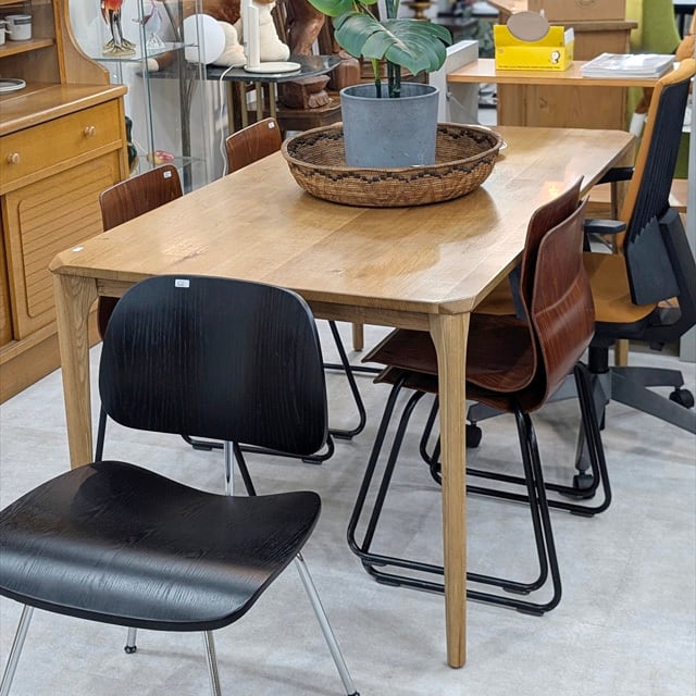 コスパクリエーションの天然木オーク材4人用ダイニングテーブルを仕入れてきました。すっきりとした床に向かってエイジングされた4本脚と天板4つ角のエッジ、オーク材の木材を感じられる仕上げと厚みを抑えた薄さのバランスがとてもいいダイニングテーブルとなります。4人でもゆったりとしたサイズでお使い頂けます。一部に木材を使用していたり、ナチュラル~ブラウンくらいの色味の椅子なんかを合わせるのが最適かと思います。