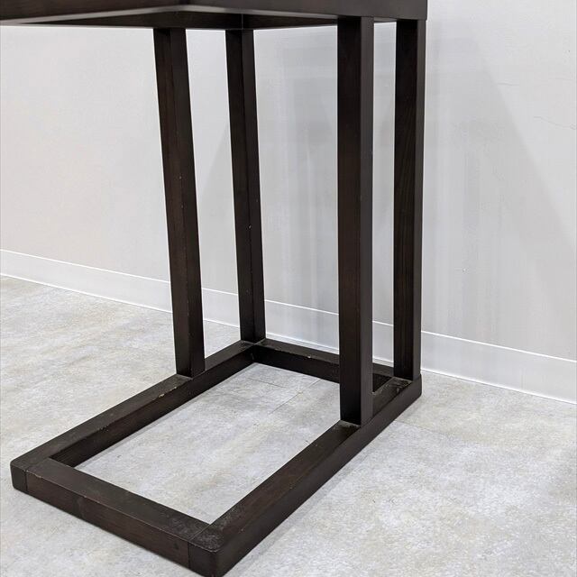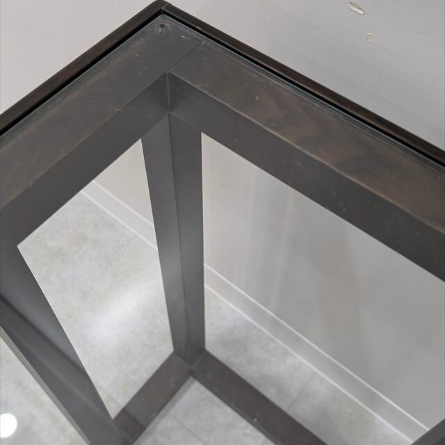 ダークブラウンに塗装されたウッドフレームのガラストップサイドテーブルを仕入れてきました。四つ角に柱があるわけではないので、下手前側に観葉植物置いたり、空間をソファに差し込んでちょっとした作業台なんかとしてお使い頂けるかと思います。北欧モダンやアジアンスタイルに合いそうですね。