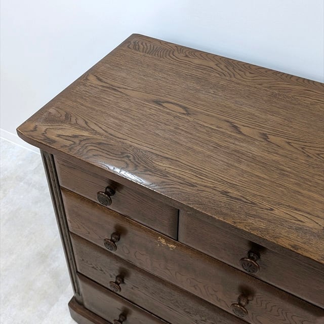 北海道旭川で作られたオーク無垢材を使用した5ドロワーチェストを仕入れてきました。北海道は家具などに使うのに適した優良な木材が多くあり、それらを使用して多くの良い家具が生産されていますが、こちらもその一つ。オーク無垢材を使用することでとてもしっかりとしており、塗装自体もブラウンでもクラシックすぎないインテリアに合わせやすく仕上がっています。