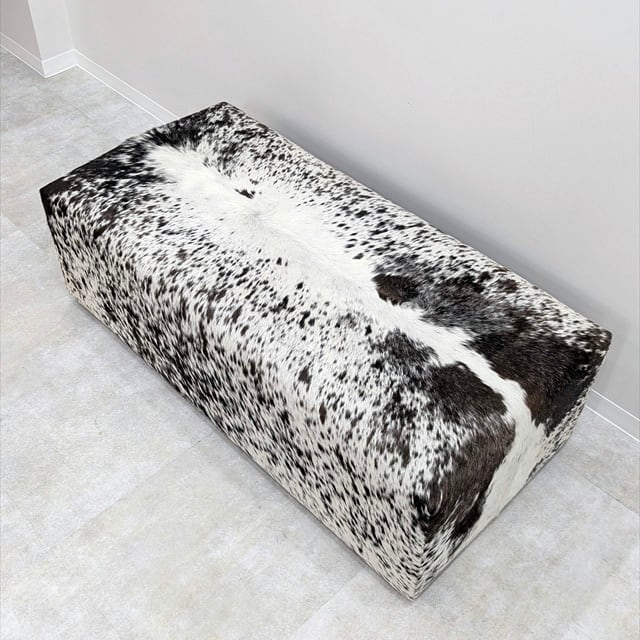 南アフリカにて作られたボックス型のベース裏面以外を全面にハラコがカバーリングされた贅沢でサファリ気分を味わえるとても珍しい大型のオットマンになります。これだけのサイズのハラコが使われているだけで高級品なのが分かります。デザイン性やトレンドのファッションやインテリアを掲載する雑誌ELLEでも取り上げられていた一品となります。広いお部屋に配置することでインテリアの強烈なアクセントになりますし、生き物の息吹が感じられるでしょう。物販店の什器やホテルでの使用もオススメです。