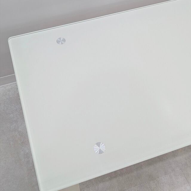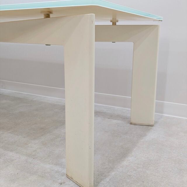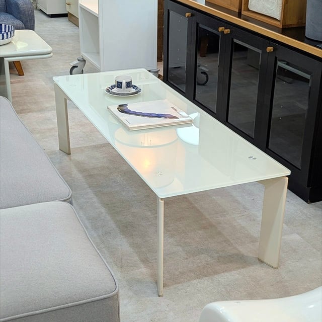 詳細は分かりませんでしたが、X状のマットなホワイト塗装をしたスチールベースに乳白色のライトブルーっぽいガラスを天板に合わせたモダンなリビングテーブルになります。壁際でローボードとして使うのもいいかもしれません。すっきりとしたシンプルでスタイリッシュなデザインと横幅に対して奥行が浅くあまり無いサイズ感が良いなと思い仕入れて来ました。天板と脚を固定する天板から見える丸いシルバーの部材もアクセントかなと思います。