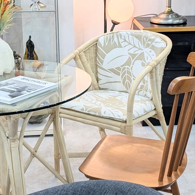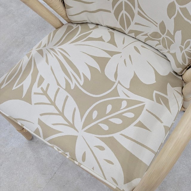 繊細なラタンのフレームに、上品なリーフ柄のファブリック。