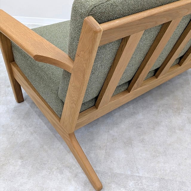 天然木の美しいフレームと、落ち着いたグリーンのファブリックが、お部屋に温かみと洗練された雰囲気をもたらします。アーム部分が広く、カップを置いたり本を置いたりと、サイドテーブル代わりにも使える実用性も兼ね備えています。