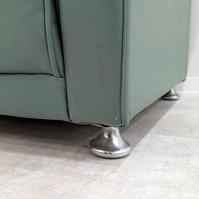 さらに注目すべきは、足元のクロームメッキされたステンレス脚。温かみのあるレザーと丸いフォルムに、すっきりとシャープなモダンな印象をプラスし、このソファのデザインの完成度を一層高めています。この絶妙なコントラストが、本当に「良い感じ」なんです。