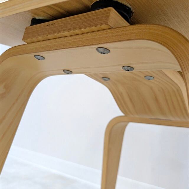 この椅子の最大の魅力は、三次元曲面が生み出す柔らかなフォルムと、体に寄り添うような優しい座り心地です。プライウッド(成型合板)独特のしなりと、背もたれを支えるラバー製の「ショックマウント」が衝撃を吸収。木製とは思えないほど、ゆったりと快適な時間を過ごせます。